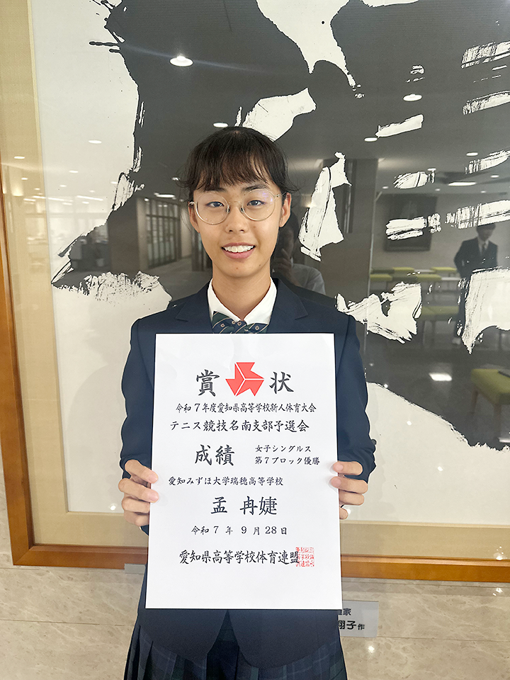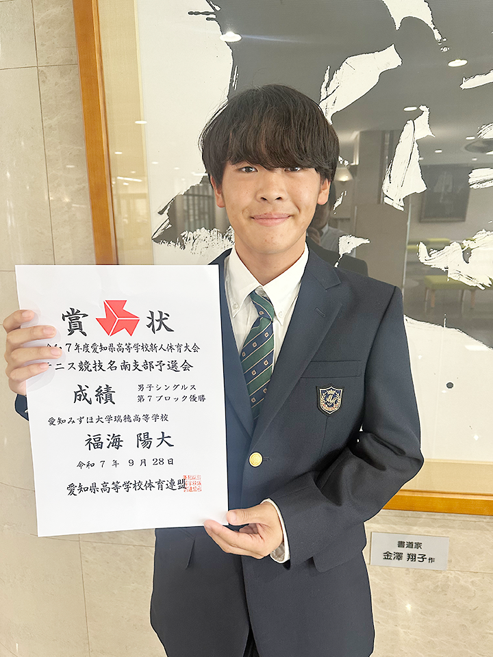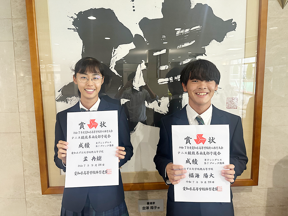 9月に行われた愛知県高等学校新人体育大会テニス競技名南支部予選会の男子シングルスで福海陽大くん(ふくうみ ひなた 2年 日進市立日進東中学出身)が、女子シングルスで孟冉婕さん(もう らんじぇ 2年 名古屋市立滝ノ水中学出身)が、それぞれブロック優勝(ともに第7ブロック)を果たし、10月11日(土)から開かれる県大会への出場が決定しました。
