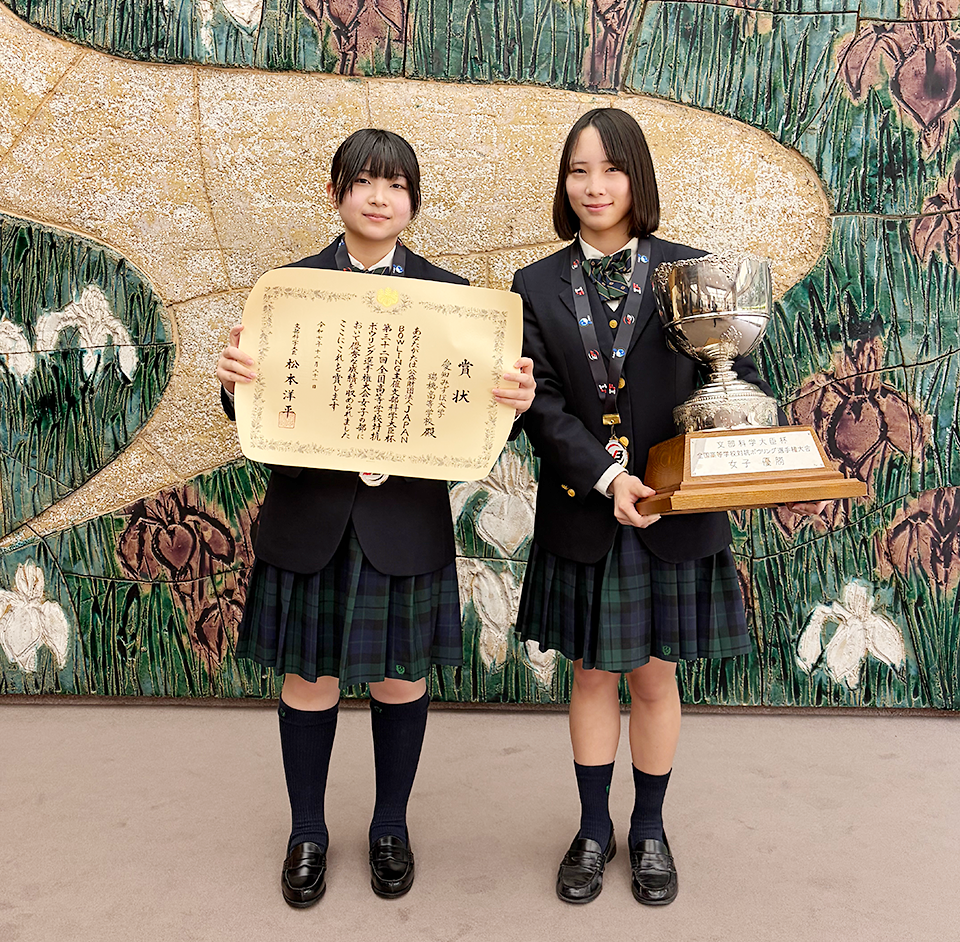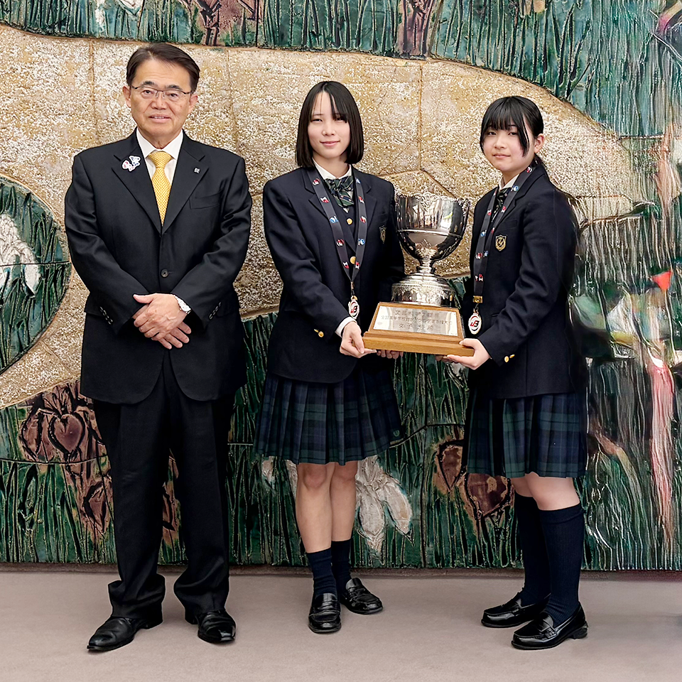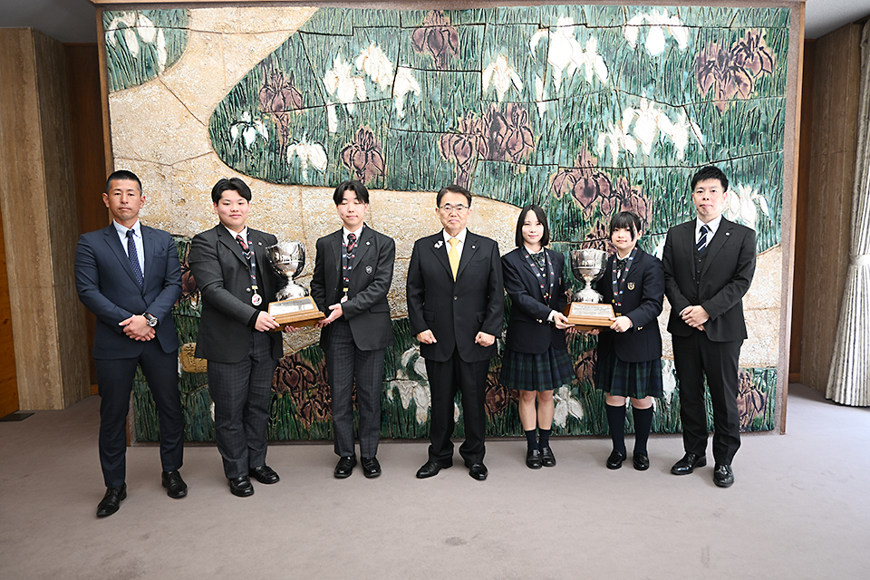 3月13日(金)に昨年12月に開催された文部科学大臣杯第32回全国高等学校対抗ボウリング選手権大会の女子の部で優勝した住田結萌さん(すみた ゆめ 令和7年度卒業 名古屋市立東港中学出身)と前野夢來さん(まえの ゆら 2年 愛西市立佐屋中学出身)が、男子の部で優勝した清林館高校の選手と大村秀章愛知県知事を表敬訪問しました。