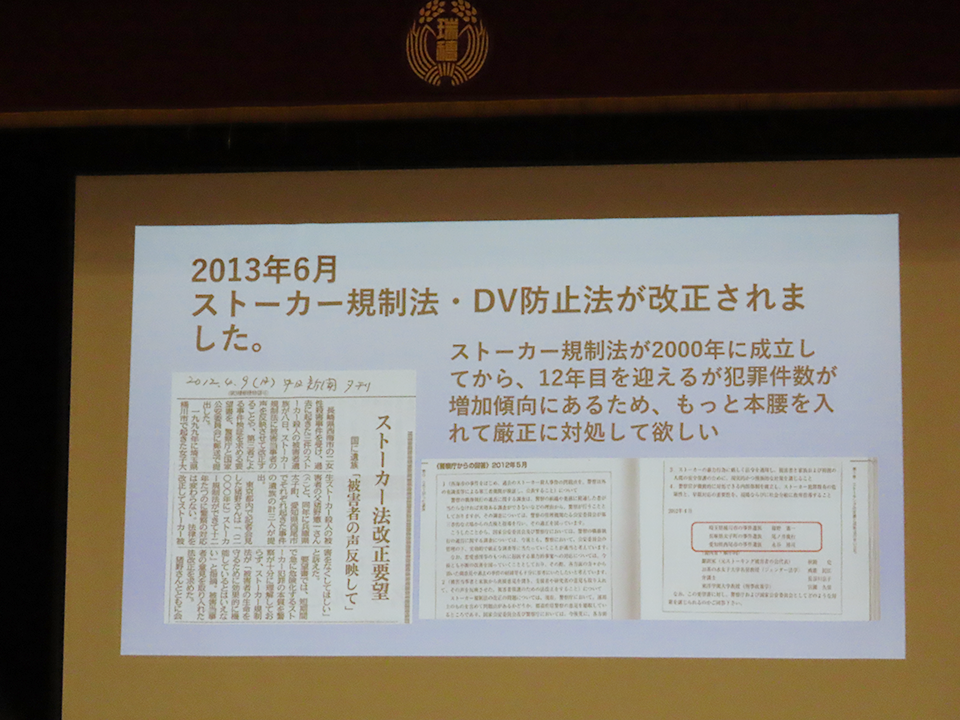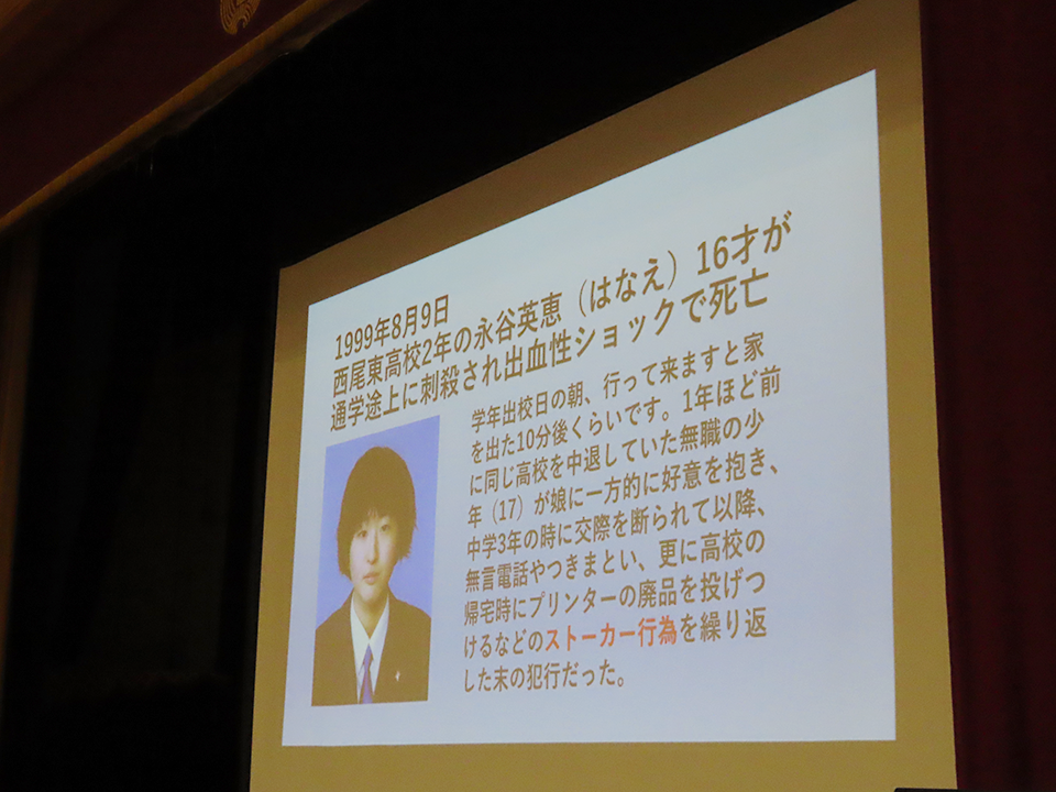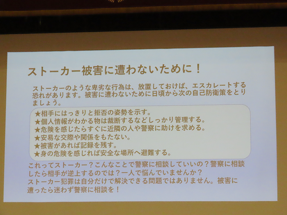 娘さんを亡くされた悲しみ、加害者に対する怒りが語られた後、ストーカーによる迷惑行為を受けているなら、すぐに警察に相談して命を守ってほしいと切実に訴えられました。